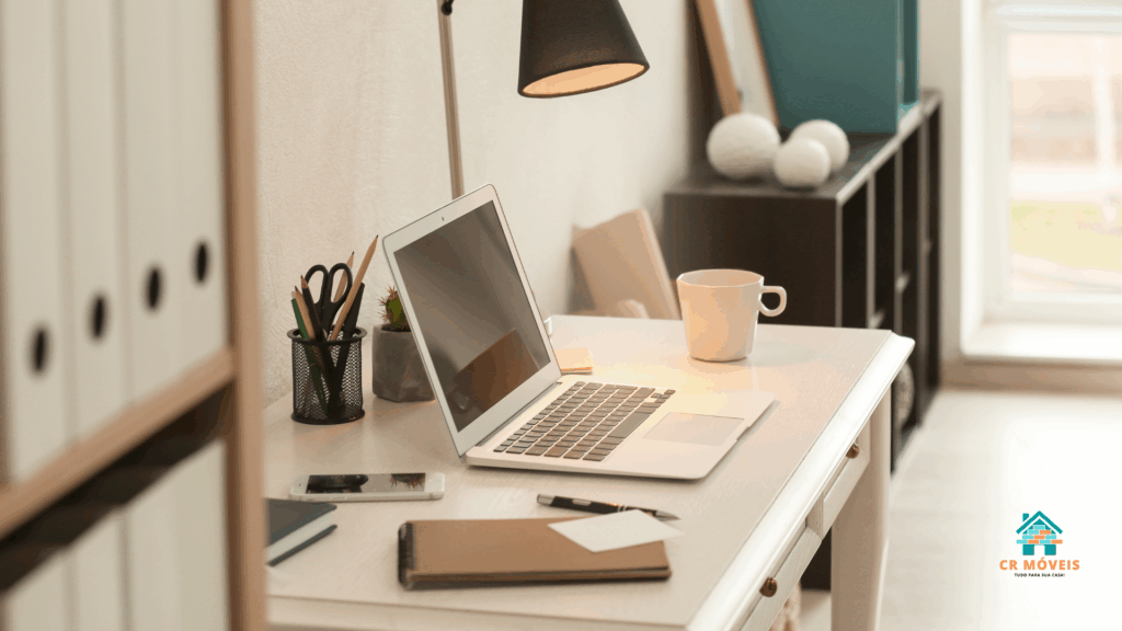 Além de ser funcional, a escrivaninha ajuda a manter o espaço organizado e pode ser escolhida de acordo com o tamanho disponível e o estilo da sua decoração.